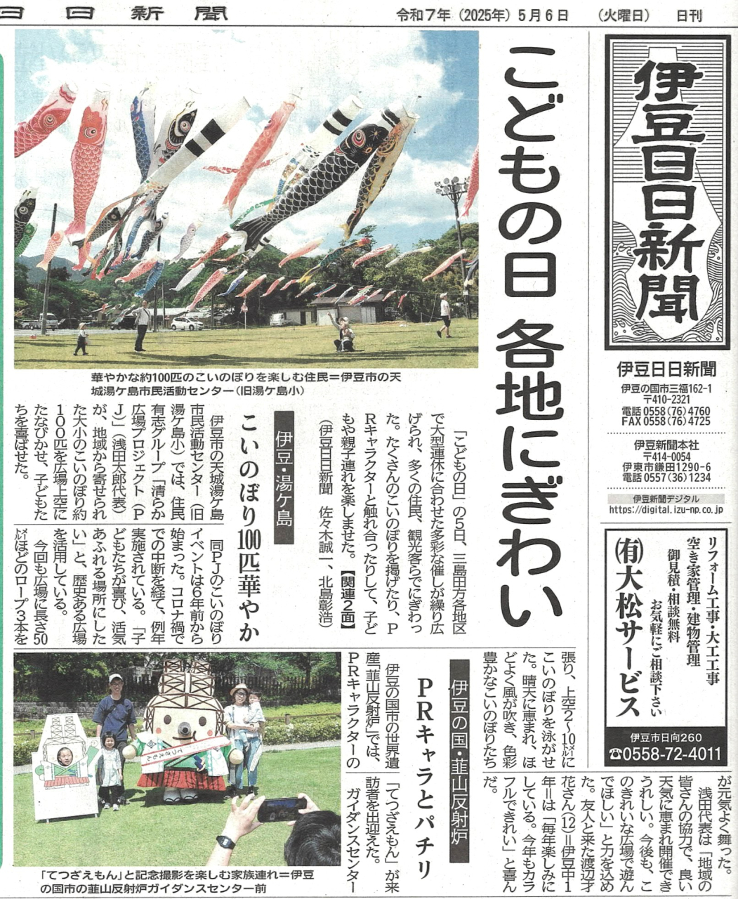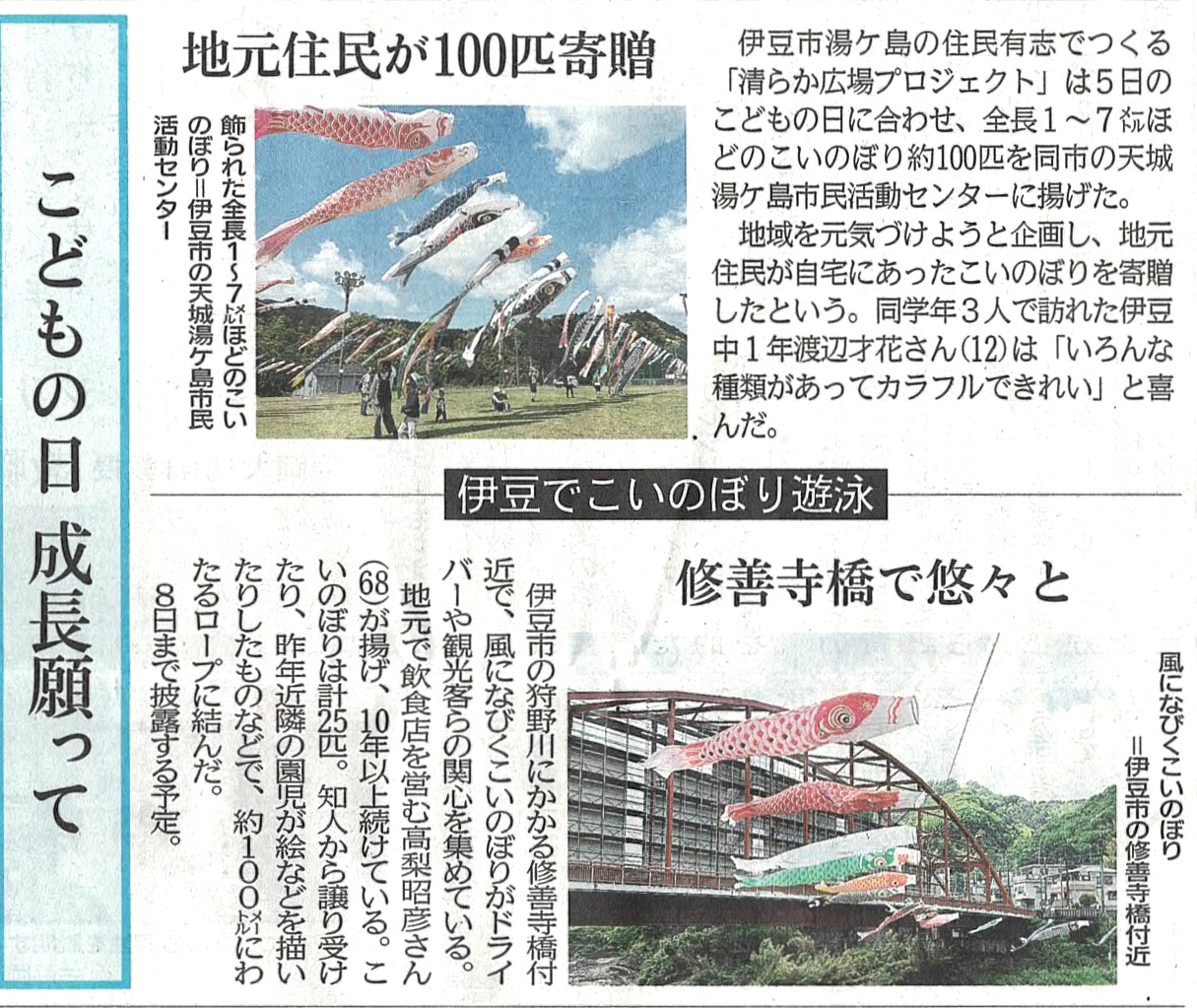 地域団体清らかひろばさんによって、令和7年5月5日、旧湯ヶ島小学校グランドにおいて、約100匹のこいのぼりが泳ぎました。